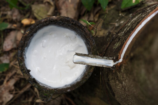 Natural Rubber Sap or Latex being Extracted by Tapping the Rubber Plant