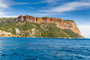 Cliffs of Cap Canaille seen from offshore, part of Route des Cretes scenic route between Cassis and La Ciotat, South of France. Coastal landscape drone view