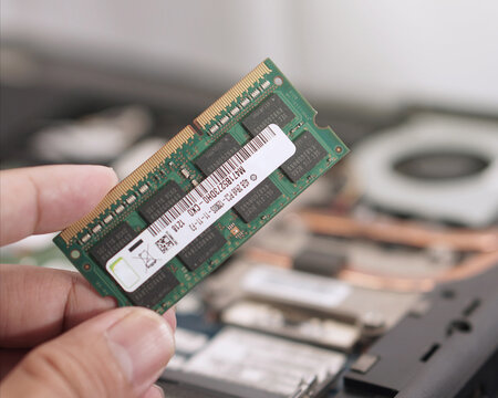 A clear view of a user holding a computer memory component. Perfect for tutorials on how to upgrade laptop RAM, identify hardware parts, or check compatibility.