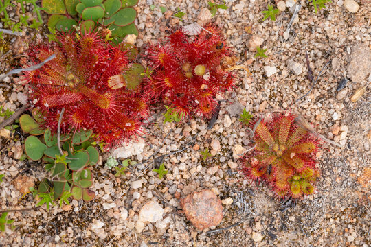 Red Rosette of Drosera seen in sandy natural habitat close to Niuewoudtville in the Northern Cape of South Africa