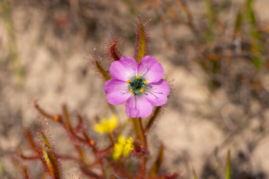 Pink flower of Drosera cistiflora, a carnivorous plant, seen in natural habitat close to VanRhynsdorp in the Western Cape of South Africa