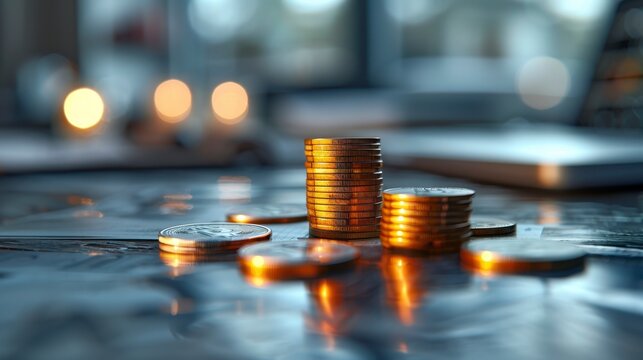 Coins stacked, reflecting light on surface, blurred background