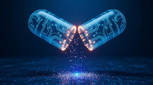 Quantum computing in healthcare concept. A vibrant capsule with a glowing blue and silver interior against a dark background.
