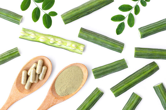 Moringa Oleifera and moringa powder capsule with green leaf isolated on white background. Top view. Flat lay.