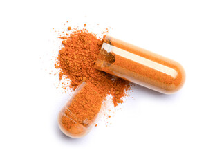 Herb capsule spilling out of a bottle
