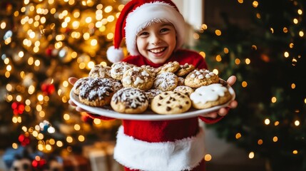 Festive joy: smiling child in santa hat with holiday cookies in front of christmas tree