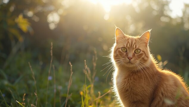 Sunlit red cat captured in detail, highlighting fur patterns and serene presence, daytime environment, Earth Day