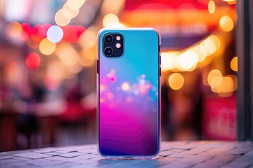 Sleek smartphone over vibrant bokeh lights