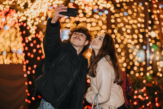 A young couple takes a selfie amid sparkling holiday lights. Their joyful moment captures friendship, romance, and festive atmosphere.