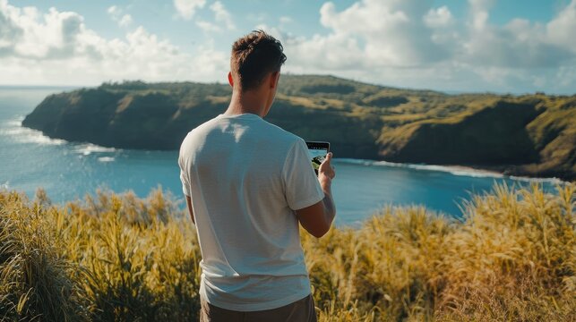 A young man stands on a lush hillside overlooking a serene coastal landscape, capturing the scenic beauty with his smartphone as the sun shines and clouds drift lazily in the sky