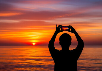 Silhouette of a person holding a smartphone to capture a vibrant sunset over the calm ocean.