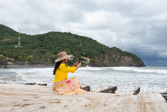 A woman with straw hat is sitting on a wooden pier and capturing the scenic view with her smartphone