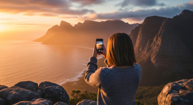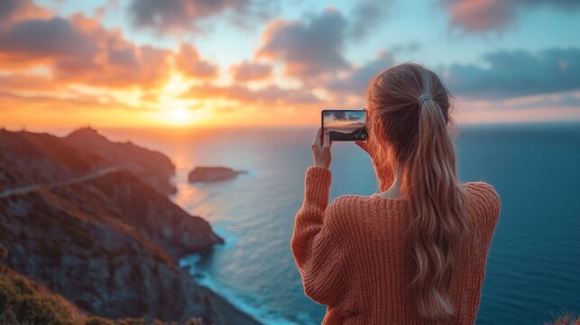 A woman in a cozy sweater enjoys a breathtaking sunset, capturing the moment with her smartphone atop a scenic cliff overlooking the ocean