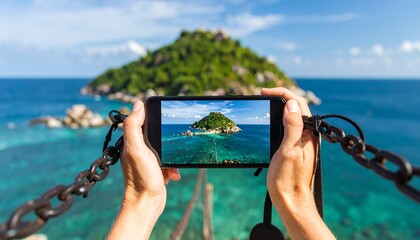 Traveler capturing a stunning view of a tropical island with a smartphone camera from a scenic viewpoint.