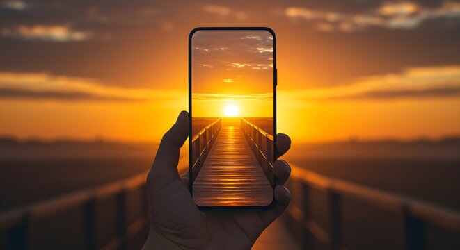 A hand holding a smartphone capturing a serene sunset on a wooden pier