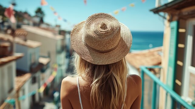 A woman with long, flowing hair wearing a straw hat looks towards the ocean, capturing a tranquil moment with a beautiful seaside view adorned with festive decorations.