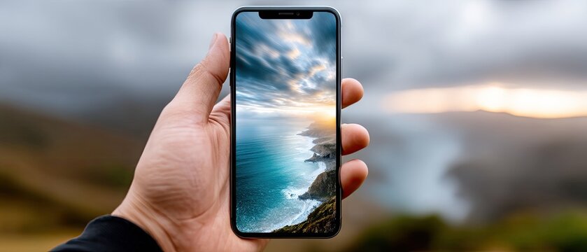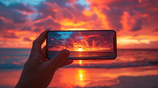 Smartphone capturing a stunning sunset over the ocean, symbolizing digital photography and nature
