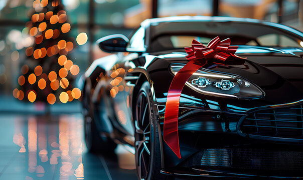 A black luxury car with a red ribbon on the hood in a showroom setting