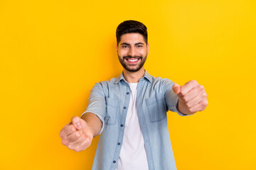 Photo of attractive man wear denim shirt smiling driving car test isolated bright yellow color background