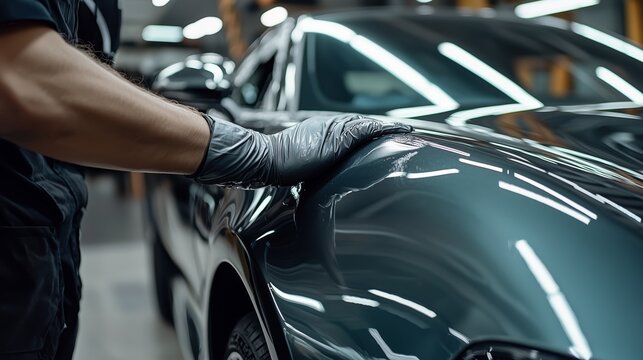 A car enthusiast applying a ceramic coating to a luxury sports car, with a focus on the paint's shine
