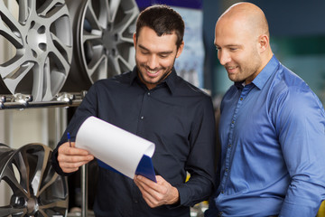 customer and salesman at car service or auto store