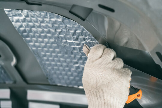 Worker glues soundproofing material to inside of car hood. Process of car sound insulation installation.