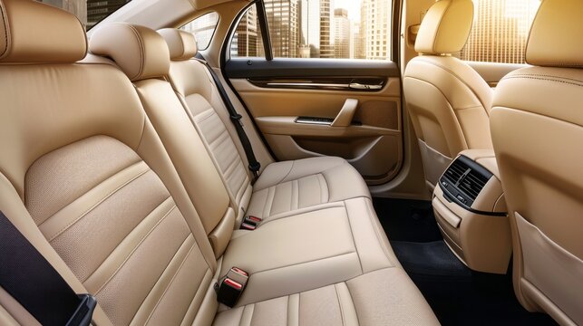 The back seat of a car is shown with a tan leather interior