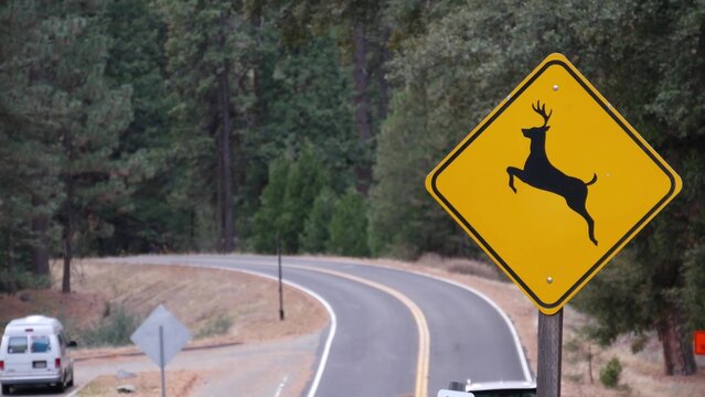 Deer crossing warning yellow sign, California USA. Wild animals xing traffic signage for safety driving on road. Wildlife fauna protection from cars in Yosemite national park forest. Road trip concept