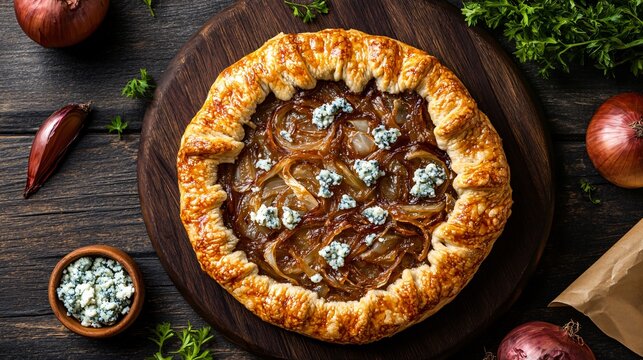 Caramelized onion and blue cheese galette, isolated on a dark wooden board, surrounded by caramelized onion slices and crumbled blue cheese