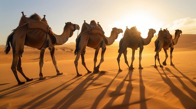 A caravan of camels walking in a line across the golden sands, their shadows stretching long in the early morning light.
