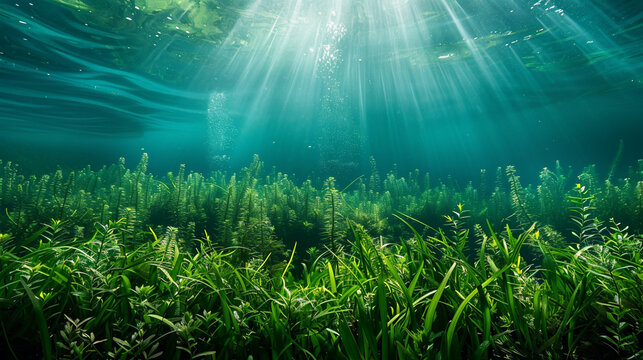 Role of Underwater plant in carbon sequestration. Kelp forest and seagrass meadow. Underwater forest carbon dioxide capture