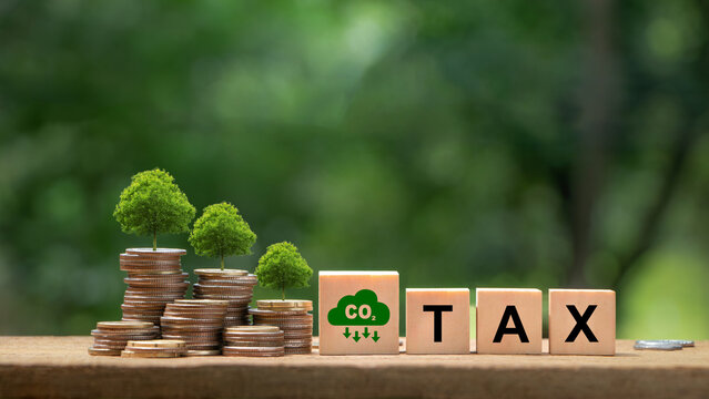 Co2 Tax.Carbon tax, environmental and social responsibility business concept.Controlling carbon emission. Words TAX on a wooden cube with Co2 icon  and coin money stack.Taxation for nature pollution.