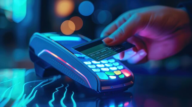 A hand using a credit card on a payment terminal, showcasing a modern transaction experience. The scene is illuminated with vibrant blue and colorful lights, creating a dynamic atmosphere.