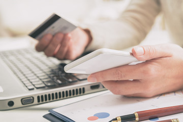 Womans hand holding credit card and smartphone