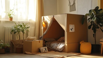A creative DIY project using cardboard boxes to build a child's fort, representing imagination and resourcefulness