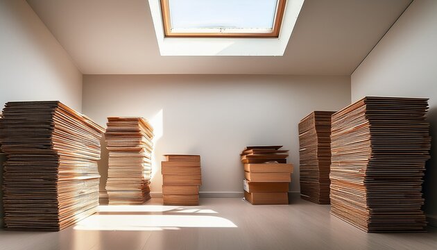 neatly stacked cardboard sheets and boxes in a bright and minimalist room