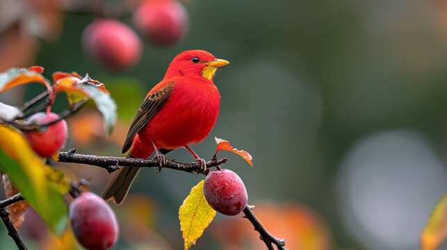 A red bird perches on a tree branch beside a fruit-laden tree Its leaves boast red and yellow hues