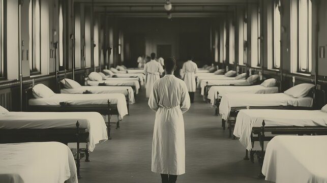 Empty mental institution corridor with minimalist design and tiled floor