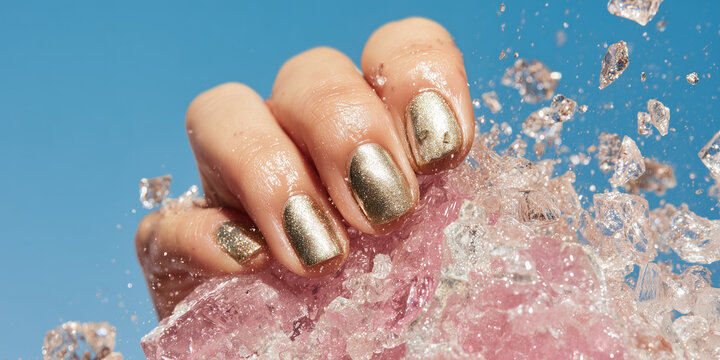 Female hand with metallic gold manicure smashing pink sugar glass ceiling symbolizing career ambition on solid baby blue background.