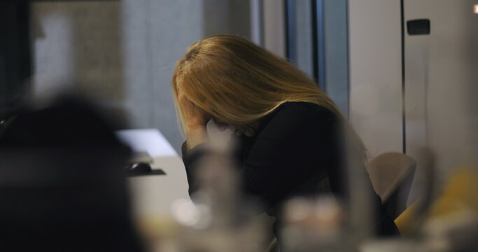 Corporate businesswoman shows signs of emotional fatigue as she leans forward with clasped hands and eyes closed during moment of private office stress