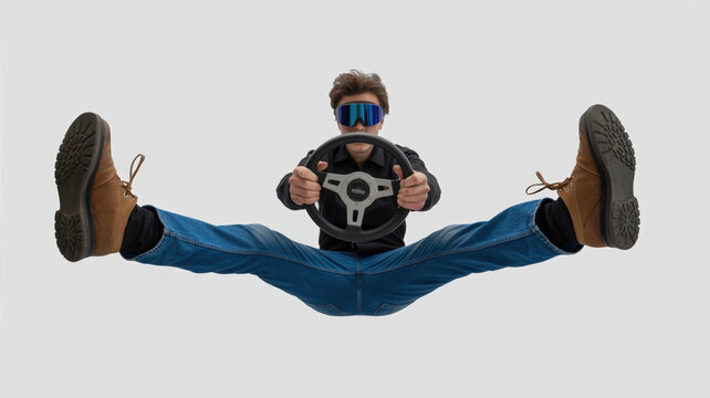 Funny Guy Levitation Driving Simulator Concept Isolated Against White Background