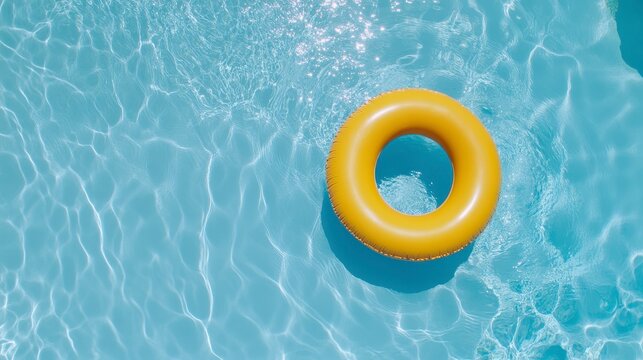 Yellow inflatable ring floats in a refreshing blue swimming pool, summer vibes.