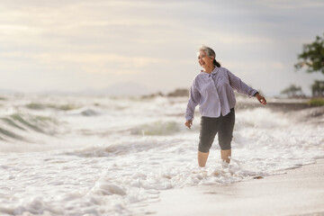 Senior Asia woman dancing on the beach with barefoot, Smile with Happily while wave in the sea rush to shore