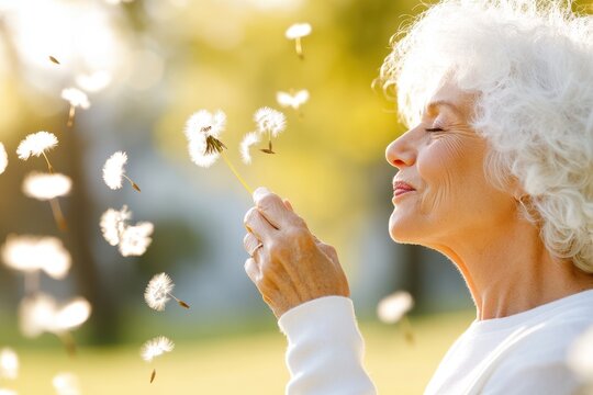 Woman Enjoying Dandelion Seeds In Nature