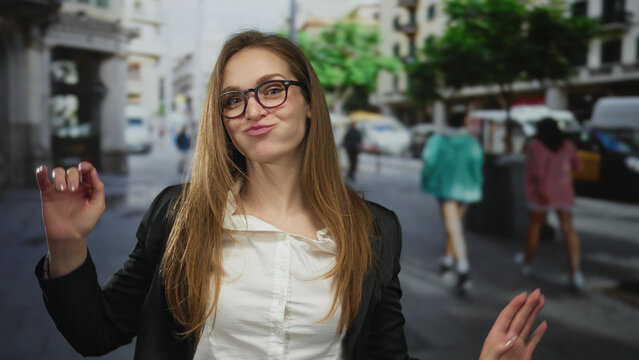 Woman wearing glasses smirks on a bustling city street with white shirt and black jacket; playful confidence.