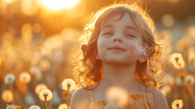 Child Blowing Dandelion - A child blowing on a dandelion, with joy and wonder on their face, symbolizing childhood and carefreeness