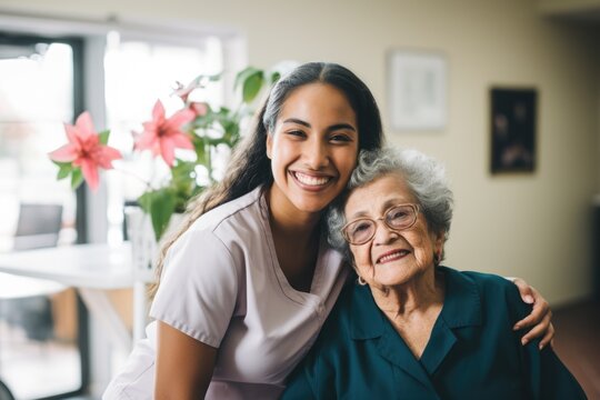 A heartwarming image of a cheerful and friendly caregiver excelling in her job, wearing a smile that reflects her satisfaction and dedication.