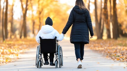 A mother and her son in a wheelchair enjoy a serene autumn walk through a park filled with golden leaves and tall trees.