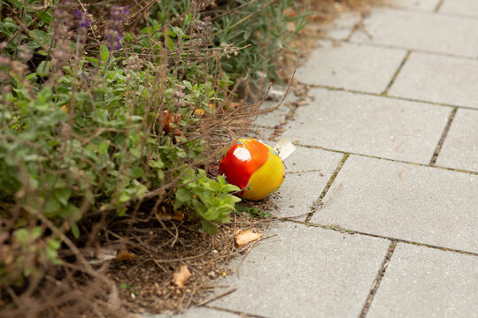 Half-eaten apple toy lying on the pavement next to bushes, symbolizing urban waste and pollution in public spaces.