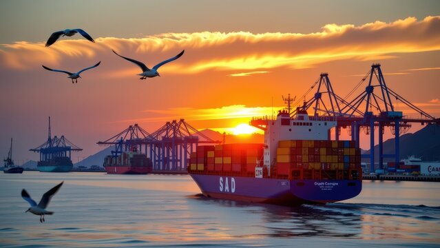 captures a serene sunset at sea, with a majestic ship and seagulls set against a vibrant sky. the sun is setting behind a large cargo ship, while three seagulls soar above its bow. in the background,